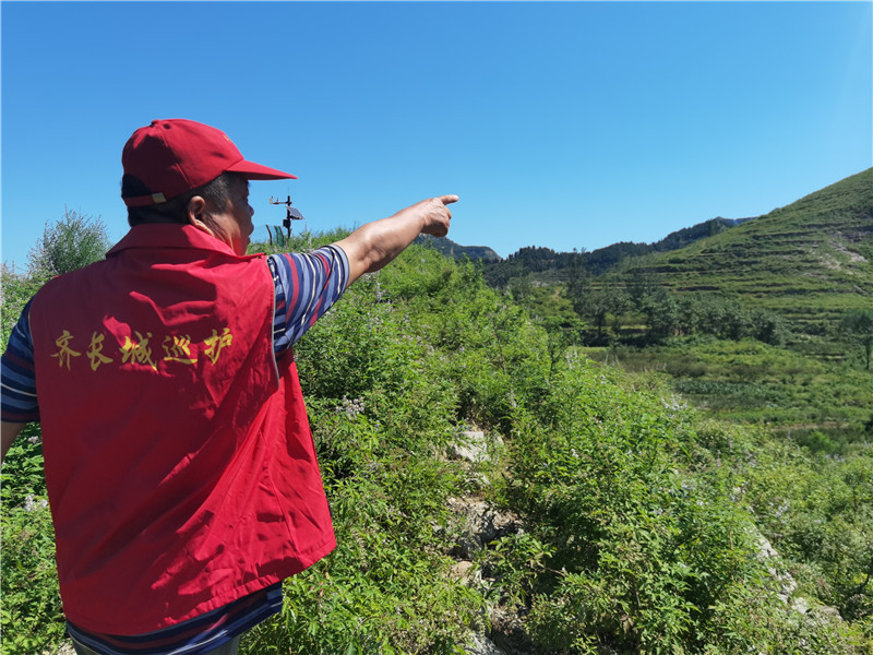 “经我们村的齐长城大约有6公里,配备了6名巡护员,每个人负责1公里,分段进行巡护。”行走在茂密的荒草丛中,韦忠村脚下的山路崎岖不平。“从小听着齐长城的传说长大,我们对这里都十分熟悉。虽然每段巡护的距离差不多,但也有远近之分,到最远的地方巡护一次,来回得七八个小时。”指着远处的一座山头,韦忠村说,那边几乎荒无人烟,但为了守护好齐长城,他们还是要到那里巡护。