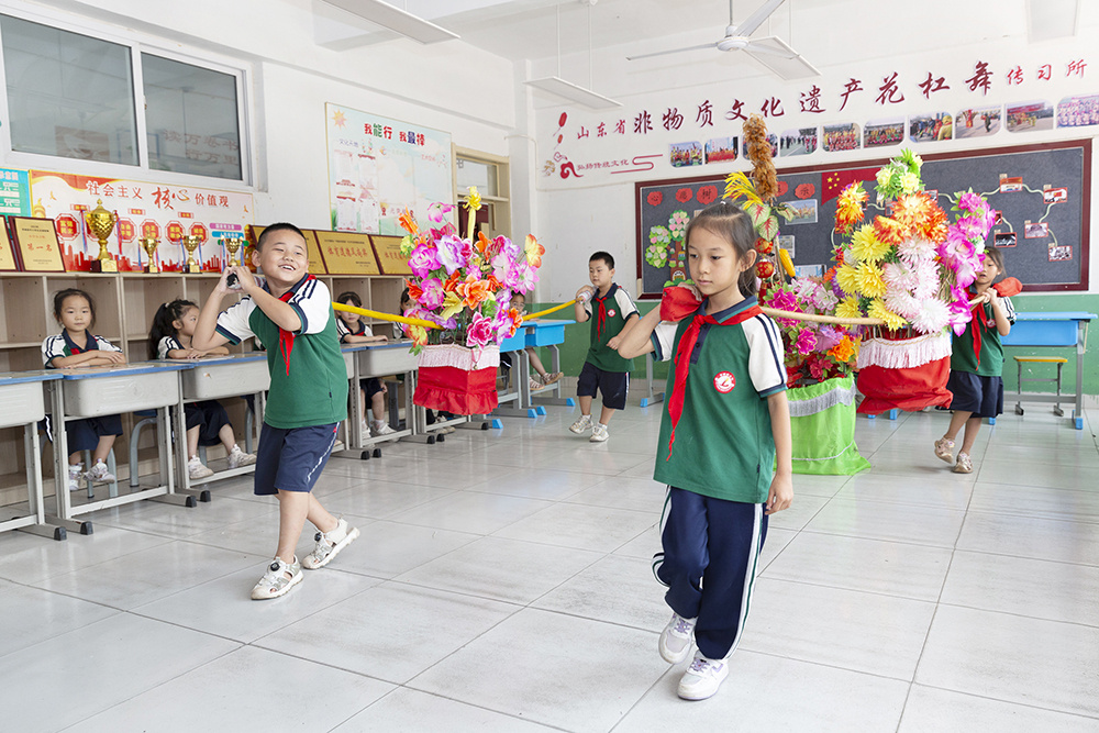 武城县南屯小学于2016年引入“非遗进校园传承入童心”项目,组建师资队伍,编制了《武城花杠舞》校本教材,把花杠等道具比例缩小,让全年龄段学生均能亲身体验传统文化。如今南屯小学已有7届百余名学生承袭了花杠舞技艺。