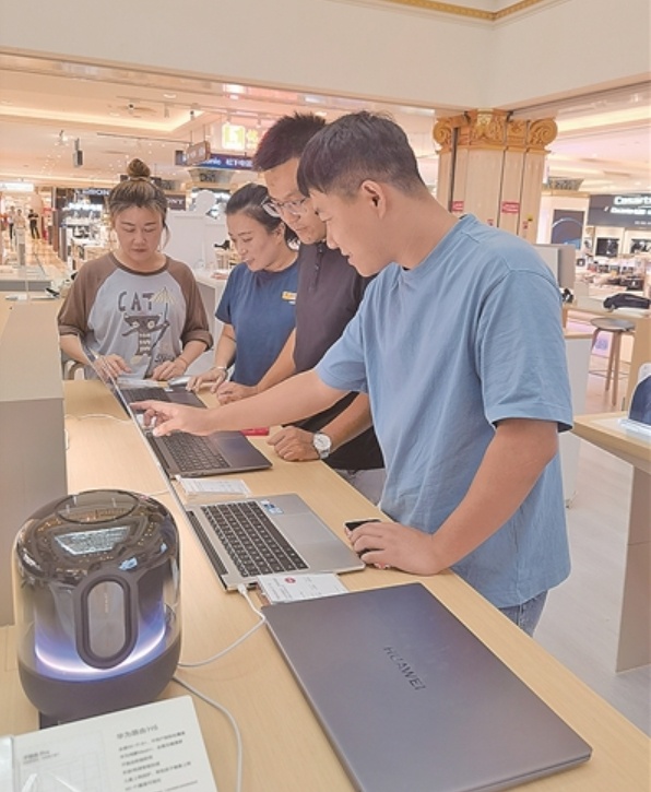 青岛一商场某品牌展区,消费者正在选购笔记本电脑