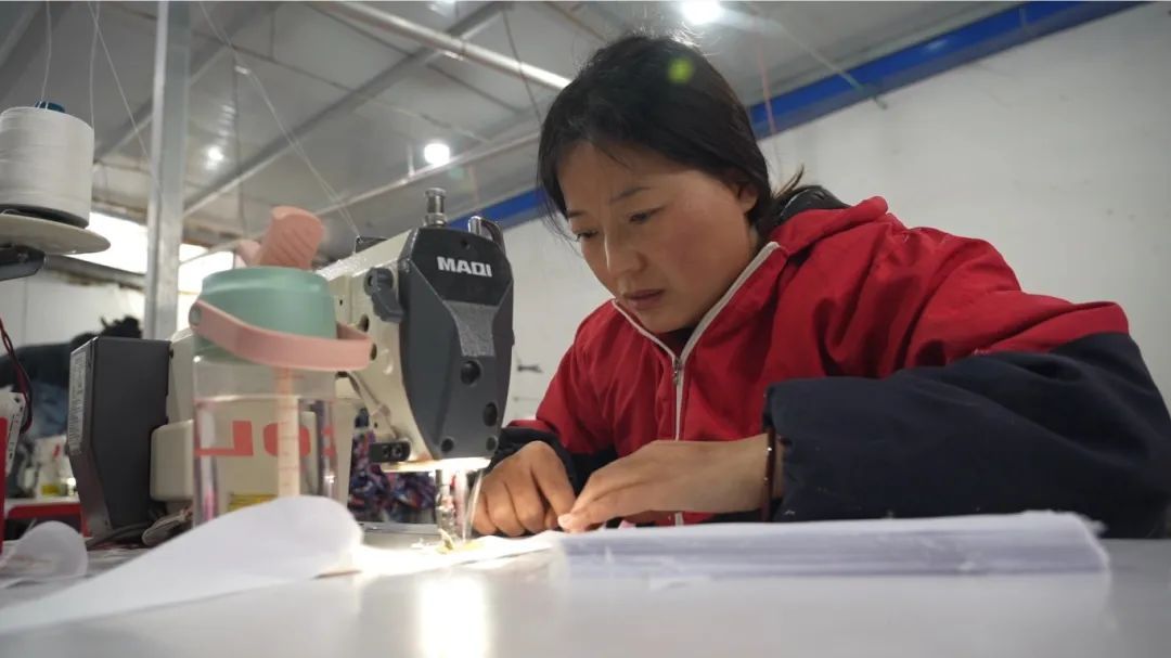 这里的工人们正加班加点地生产着苗族、壮族等民族服饰。他们手中的布料色彩斑斓,仿佛将整个车间都装点得五彩斑斓,充满了节日的喜庆氛围。