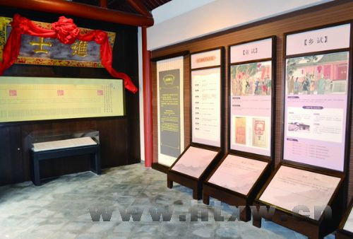 在金榜题名展厅,一进门南墙上展示的是当年王士禛中进士时的进士榜,从中可以找到“第二甲第三十六名王士禛山东济南府新城县人”。榜文正上方是一块清代的进士匾。展厅西墙上是有关科举考试情况介绍,整个展厅以王士禛读书科举为线索,形成了一个“明清科举”的科普展。