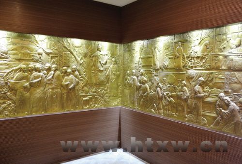 南倒座是生平陈列区序厅,一进门,“一代正宗王士禛”7个大字映入眼帘,标题字下方的《雨中度故关》是王士禛的神韵诗代表作之一,也是被康熙皇帝熟谙能诵的一首诗。康熙十一年(1672),王士禛奉旨典四川乡试,途经河北故关,留下了这首诗,后来收入《蜀道集》。序厅内,除了正面墙上简短的文字介绍王士禛生平和大事记,其余三面铜浮雕,简洁鲜明地概括了王士禛不朽的一生,在现代灯光的映照下,金碧辉煌,栩栩如生。“大槐王氏”、“公车进京”、“金榜题名”、“秋柳诗社”、“推官扬州”、“翰苑词臣”等场景,展现了王士禛波澜壮阔的人生长卷。