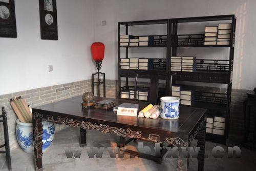 西厢房是王士禛的书斋,斋号“信古斋”是康熙皇帝赐给王士禛的匾额,题于康熙四十一年(1702),御书手迹长151厘米,宽57厘米。“信古斋”典出《论语·述而》:子曰“述而不作,信而好古,窃比于我老彭。”可见康熙皇帝对王士禛治学考信的欣赏。王士禛《香祖笔记》卷一载:“康熙庚辰夏六月二十八日,蒙恩赐御书‘带经堂’匾额,谨纪述于《居易录》末卷。今年壬午(1702年)四月六日,再蒙恩赐御书‘信古斋’匾额……”王士禛是清初著名的文学家、藏书家,他的书斋处处透露出一代博学鸿儒的文化气息,康熙四十三年(1704),王士禛回归故里后,在这里著述不辍,完成了自传年谱、《渔洋诗话》等多部著作。