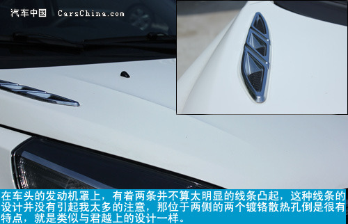 在车头的发动机罩上,有着两条并不算太明显的线条凸起,这种线条的设计并没有引起我太多的注意,而那位于两侧的两个镀铬散热孔倒是很有特点,就是类似与君越上的设计一样,只是出现在M4身上的这两个散热孔,或许装饰的作用要大于它的实用性了吧。