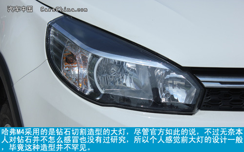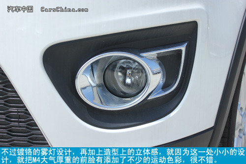 至于细节的设计,哈弗M4采用的是钻石切割造型的大灯,尽管官方如此的说,不过无奈本人对钻石并不怎么感冒也没有过研究,所以个人感觉前大灯的设计一般,毕竟这种造型并不罕见;而让我眼前一亮的则是那镀铬的雾灯设计了,再加上造型上的立体感,就因为这一处小小的设计,就把M4大气厚重的前脸有添加了不少的运动色彩,很不错。