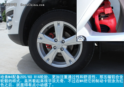 哈弗M4配备205/60 R16轮胎,更加注重通过性和舒适性,那五幅铝合金轮毂的样式,虽然看起来很平淡无奇,不过在M4把它的制动卡钳涂为红色之后,就显得有点小动感了,其实大家都懂,哈弗M4只是面向家用,这样的车轮还是蛮可以的了。