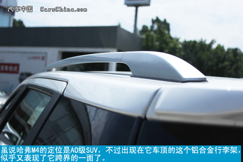 哈弗M4的长宽高分别为3961/1728/1617mm,而轴距仅为2383,虽然它定位是AO级的SUV,不过这样的尺寸却更像是一款家用的两厢车,不过不得不到说的是,M4拥有这185mm的离地间隙,在提高自身的通过性的同时,似乎也证明了一下自己的SUV身份了,但是再看那位于车顶的铝合金行李架,又似乎表了M4跨界的一面。