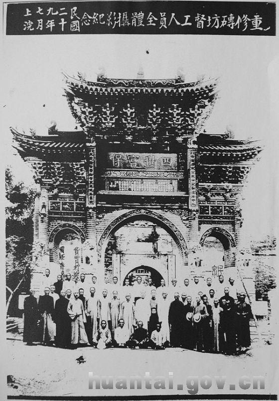 这是一张保存下来的拍摄于民国二十九年的老照片,为当时新城县重修四世宫保牌坊人员的合影照。照片上人员所处的位置为城墙外,隐约可见护城河岸上的树木。