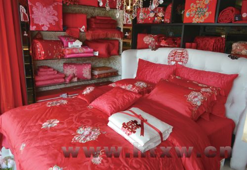 据该店负责人王经理介绍,该款“囍妆”床品是棉涤提花面料,采用刺绣工艺,配件中多处运用独版绣花,在被套与短枕的设计里采用独版绣花,进一步突出了产品的与众不同,简单大气的绗缝靠枕,更加凸显了产品的视觉效果。