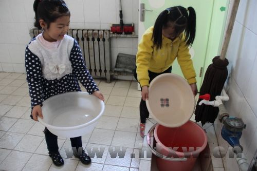 其他班级内,一系列“节约用水”的活动正在同时上演。唱节水儿歌、设计节水标志、用洗过手的水冲刷厕所、讲节约用水的小故事……这一天,县实验幼儿园的师生们一起上了一堂生动的“节水课”。