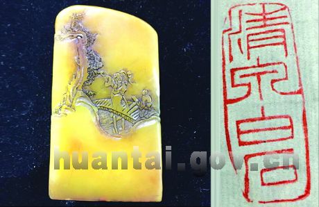 此印文为“清泉白石”,寿山石,田坑料,原石带皮随形巧雕,石质润泽,包浆厚重。浮雕图案“张良拾履图”,一老者拄杖立于桥头,如有所指,一年轻人恭立一侧,神态恭敬。另有古松虬枝,怪石嶙峋,皆苍劲有力。远看高山耸立,奇峰叠翠。背面则浮雕小船侧畔,茂盛芭蕉。