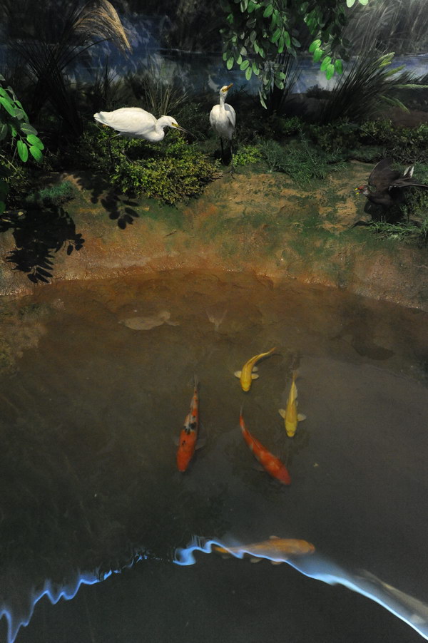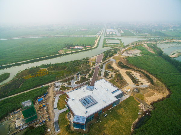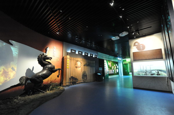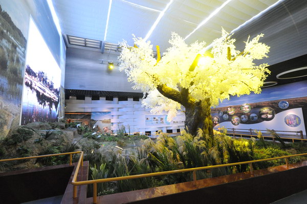 ? ? 踏入大厅,空间宽阔明亮、简约生态,给人一种清新的情调氛围。飘逸的枝杈,绿色的草原,灵动的白鹭,构成顶部的层次感,印证了杜甫《绝句》诗中的“一行白鹭上青天” 的自然意境。前方的立体沙盘和LED大屏展示马踏湖湿地公园的风采。(摄影报道/ 成国栋 张瑶)