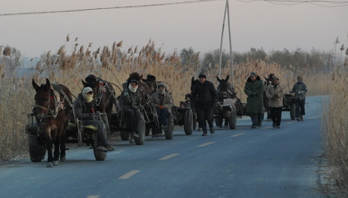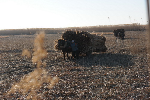 初冬的马踏湖,正是收割芦苇的季节,这里的运输工具一是小船,二是马车。