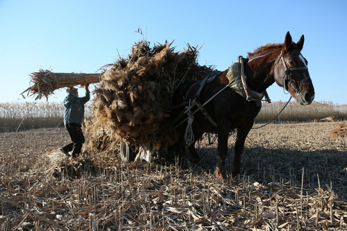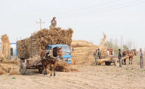 车老板每车可装50个苇子,可挣得50元,每天能拉6趟左右。(摄影报道/ 成国栋)