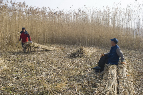 马踏湖盛产鱼、虾、鸭等外,还产芦苇、蒲席。芦苇一度是湖区群众增收的重要途径。过去,每年的立冬这天,居住在这里的人们,随着一声号令,乡里乡亲们会同时开镰,割芦苇的场面非常壮观。今年割芦苇同以往不同,由于这片湿地开始开发,割芦苇的人已经很少了,而且大部分都是老年人。鱼一村66岁的王大爷每年都割苇子。割苇子是个苦差使,又累又危险,一般人干不了,割不好就割着手或者扎着脚。王大爷说:“前几天,同我一起干活的一位老人,干着活就累倒在苇田里啦,现在的年轻人大部分都不愿意干这个活。”