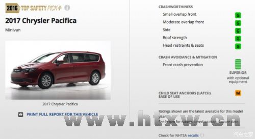 IIHS新成绩:克莱斯勒Pacifica获…