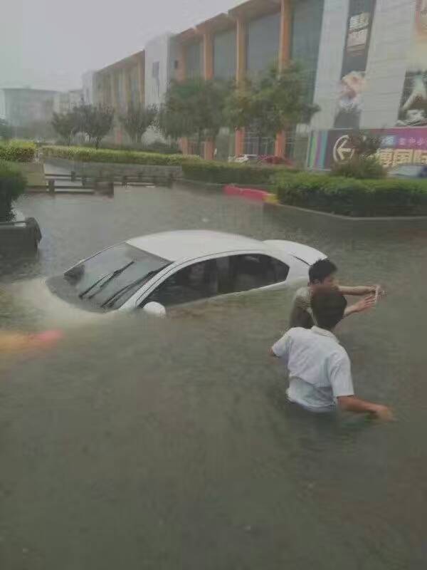 张店陶瓷科技城雨水把车都淹了。