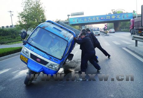 三轮车路边侧翻众警民携手扶正