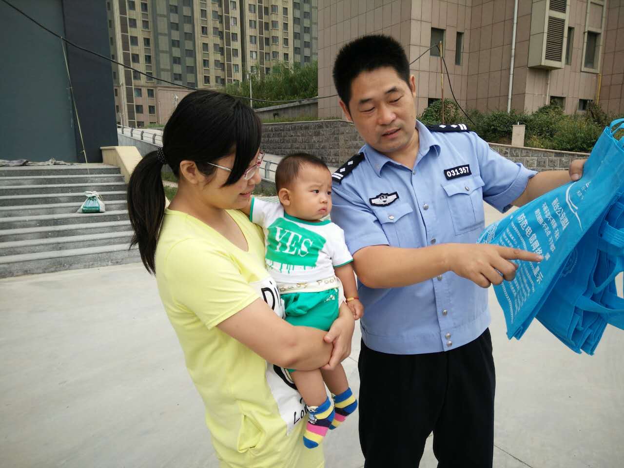 民警向群众发放购物袋并讲解防诈…
