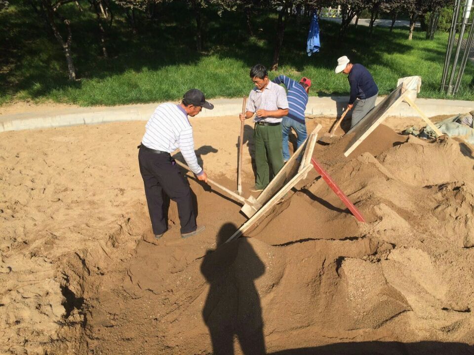 少海公园工作人员筛沙子,筛除杂…