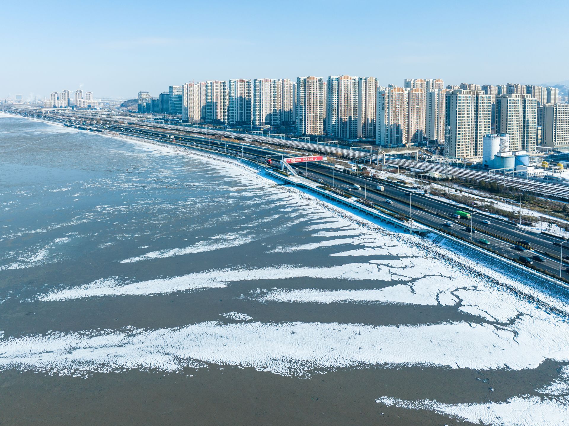 寒潮来袭,青岛后海出现冰凌景观