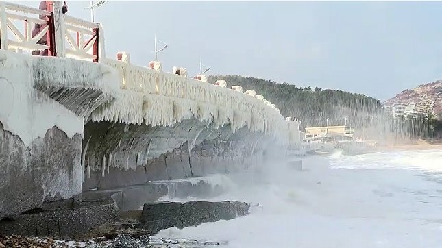 冬游威海:葡萄滩海水浴场现冰凌…