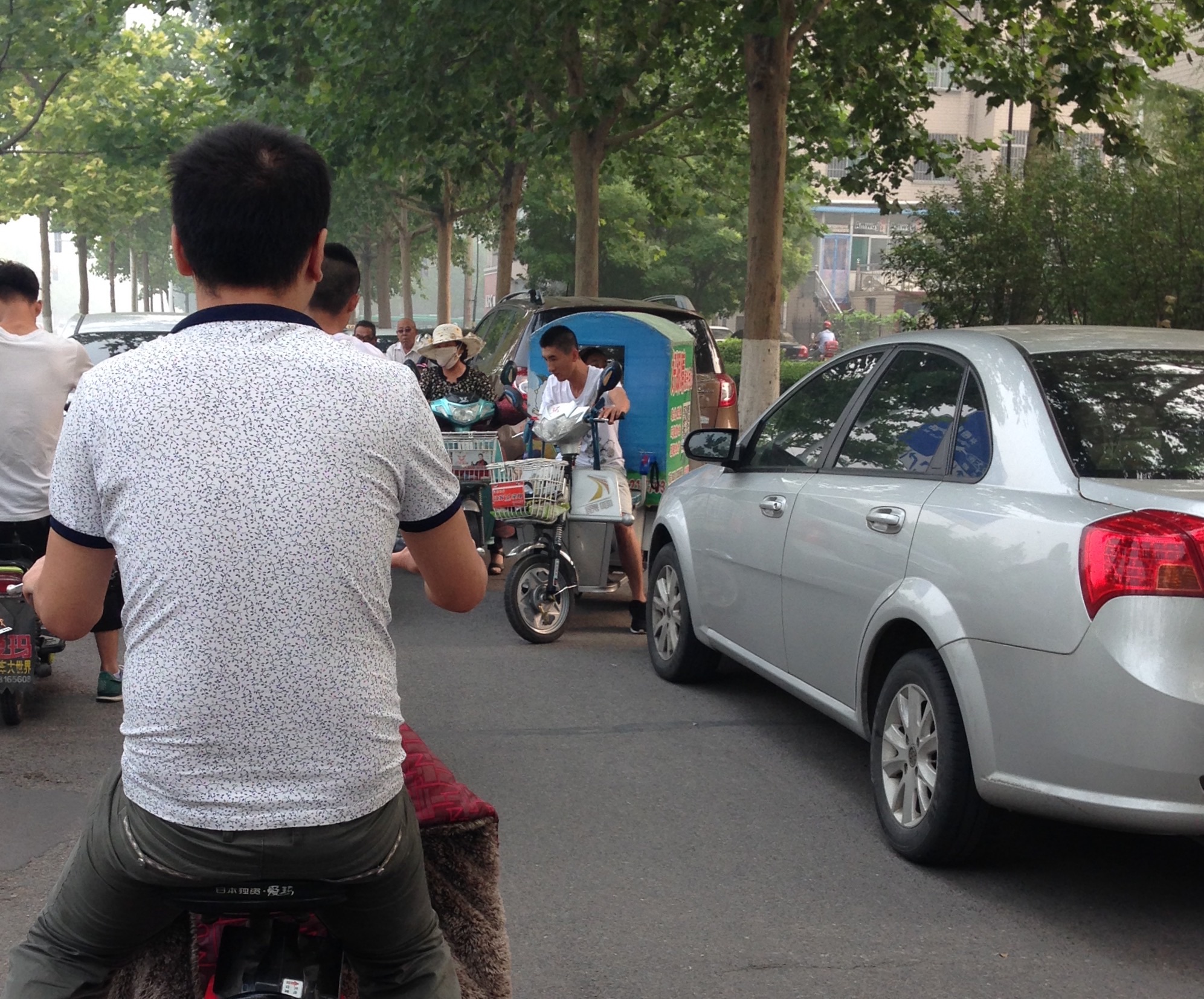 自行车道一旁停了一排车,前面又…