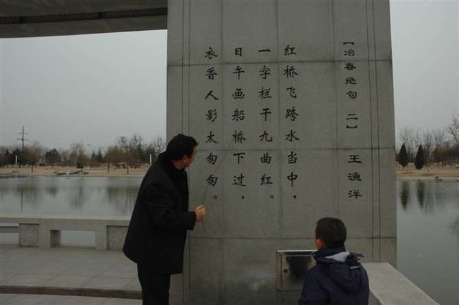 文体中心广场上爷爷给孙子读王渔…