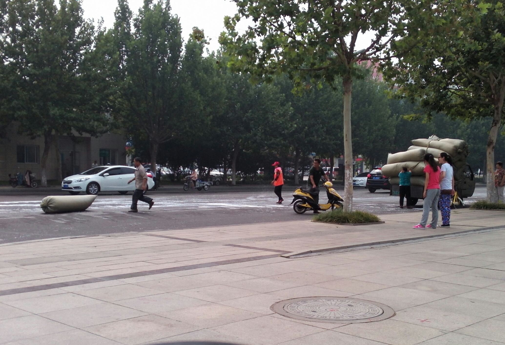 中心街县政府前公路上工人正在作…