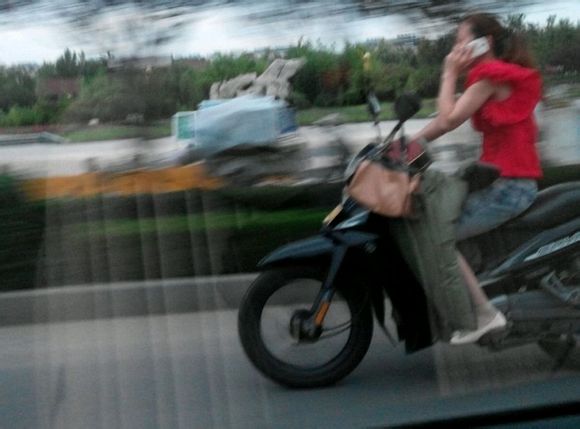超女,单手起摩托,一手打手机!