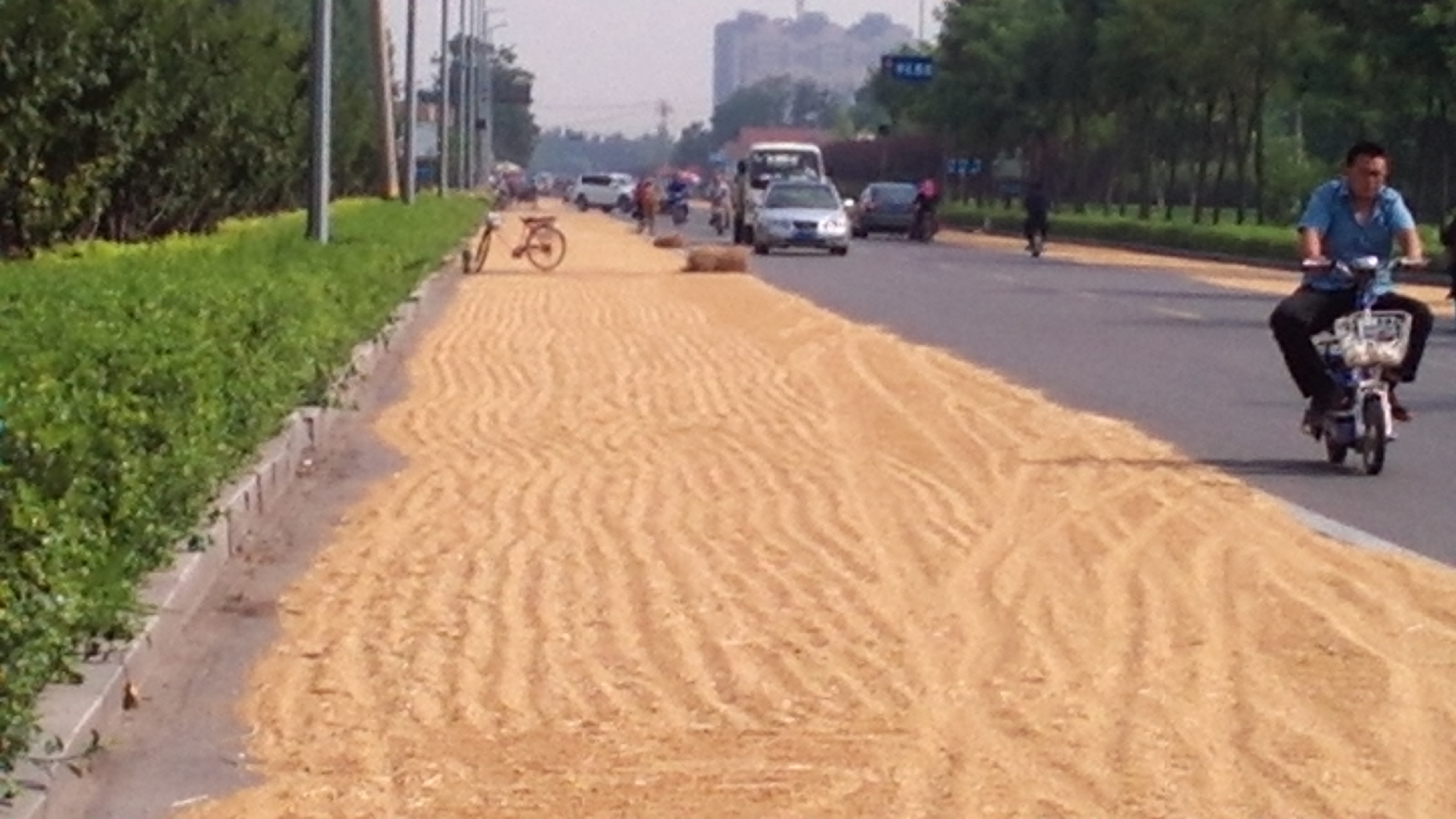 公路旁晒上了麦子。