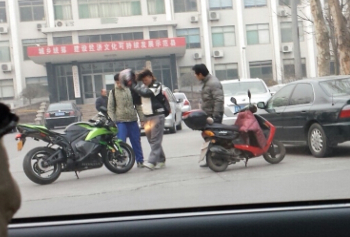 两辆摩托车相撞,车主正在交涉。