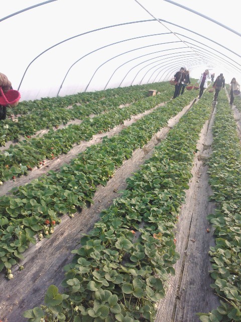 冬日的周末,去大棚摘草莓的市民…